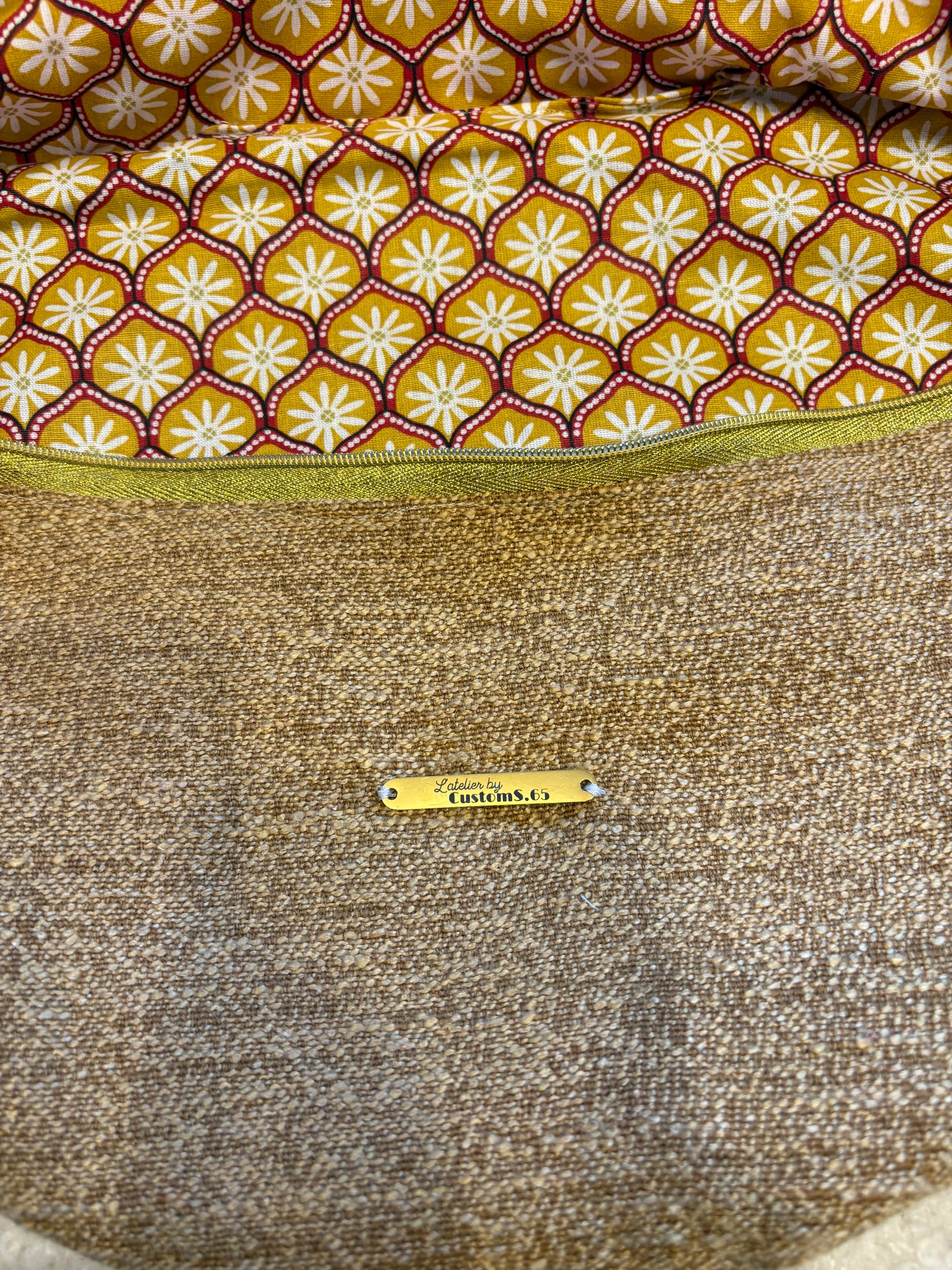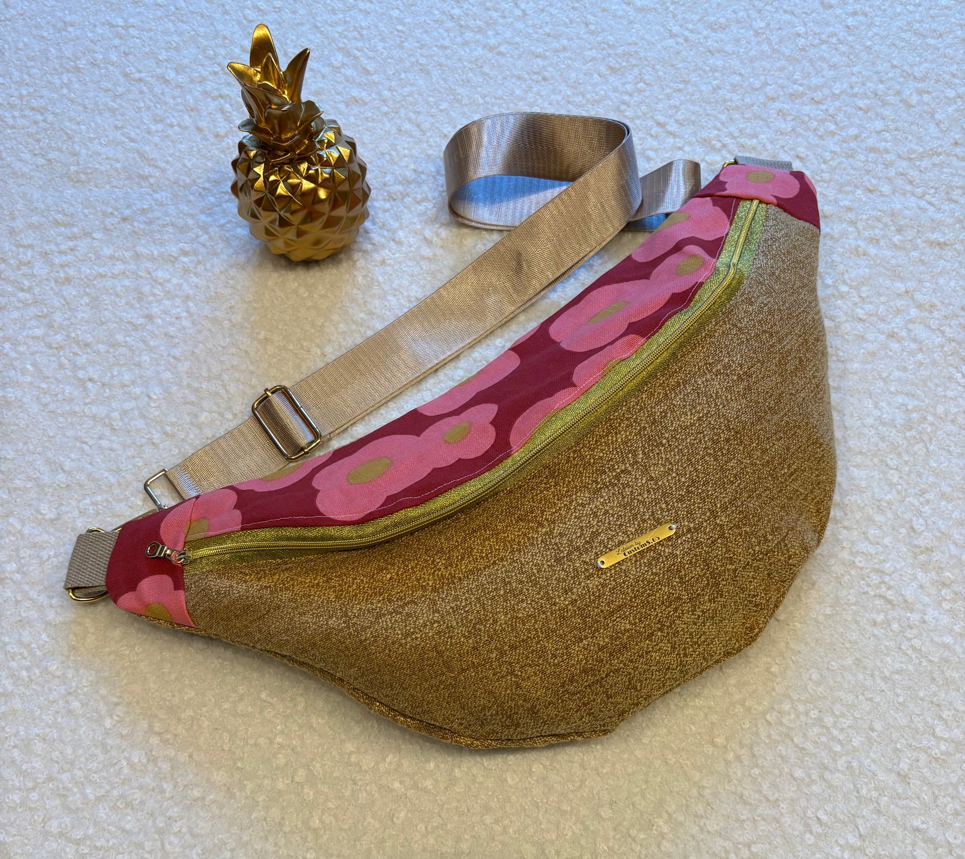 Sac banane XXL toile jaune or capot fleuri rouge sangle dorée