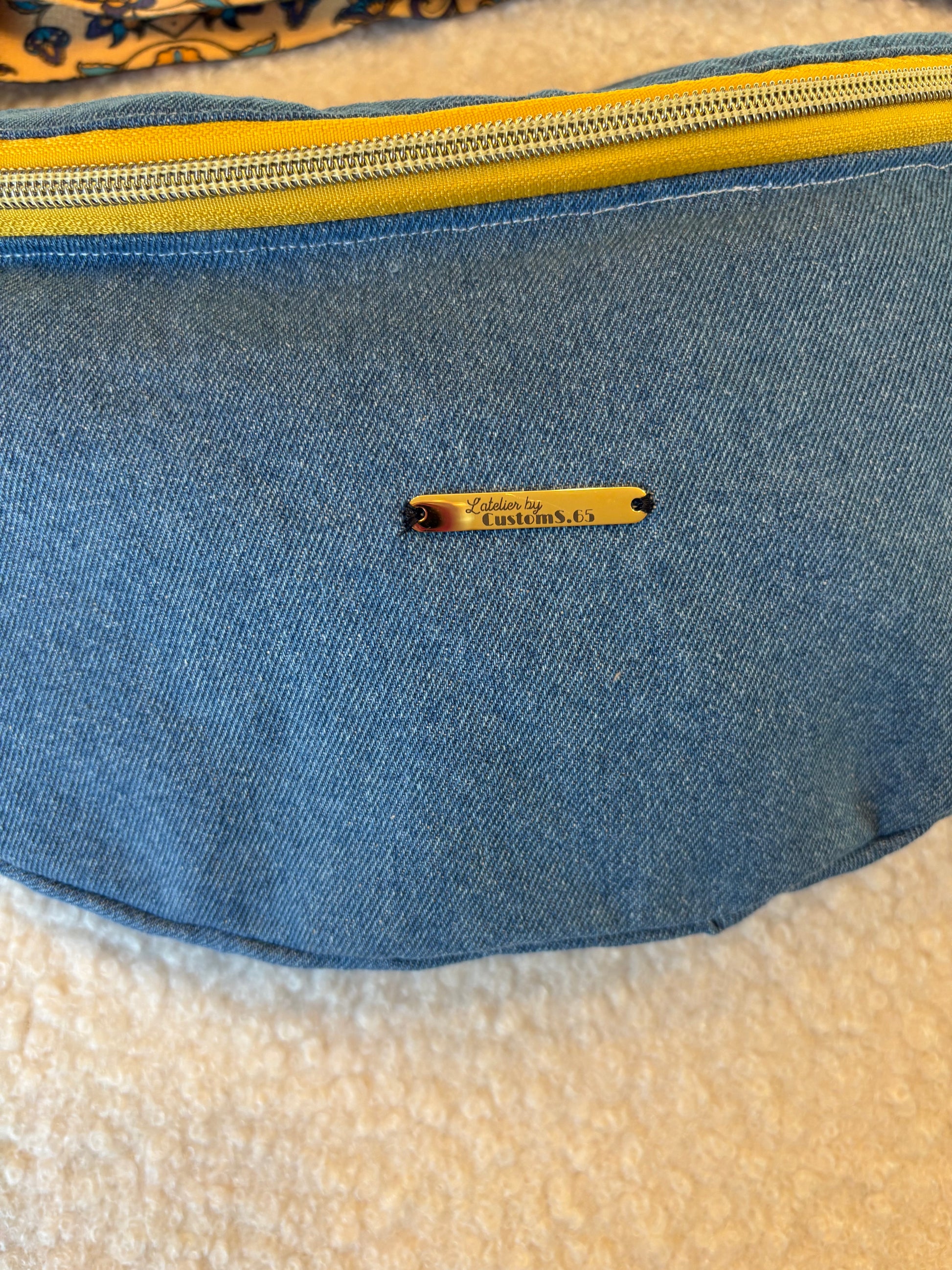 Sac banane XXL jean foncé fermeture jaune sangle fleurie jaune