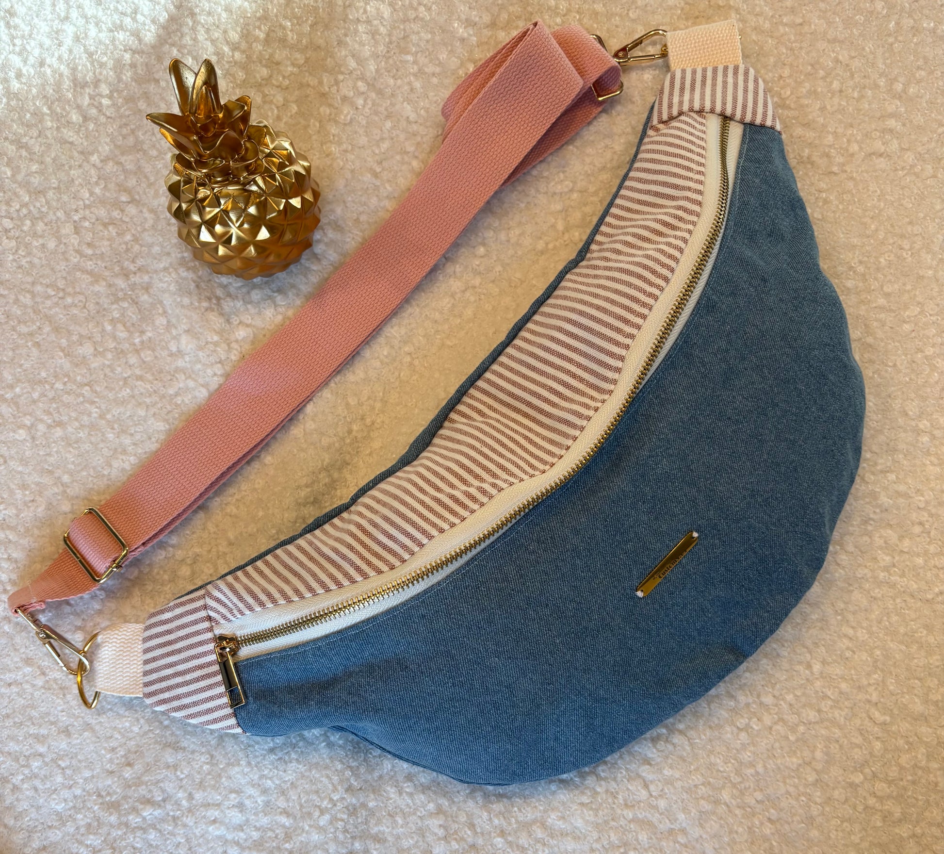 Sac banane XXL jean foncé capot rayé blanc rose pailleté sangle unie rose