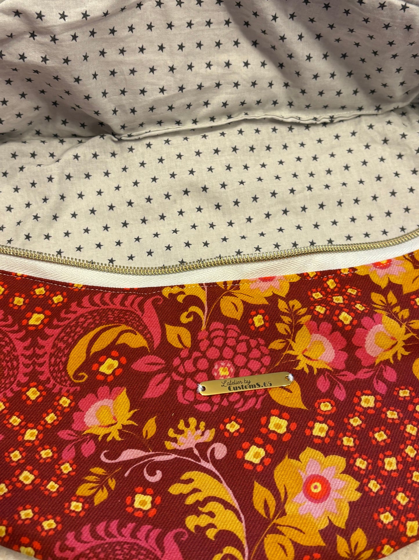Sac banane XXL fleuri rouge orangé capot velour cotelé (fine côte) écru sangle unie écru