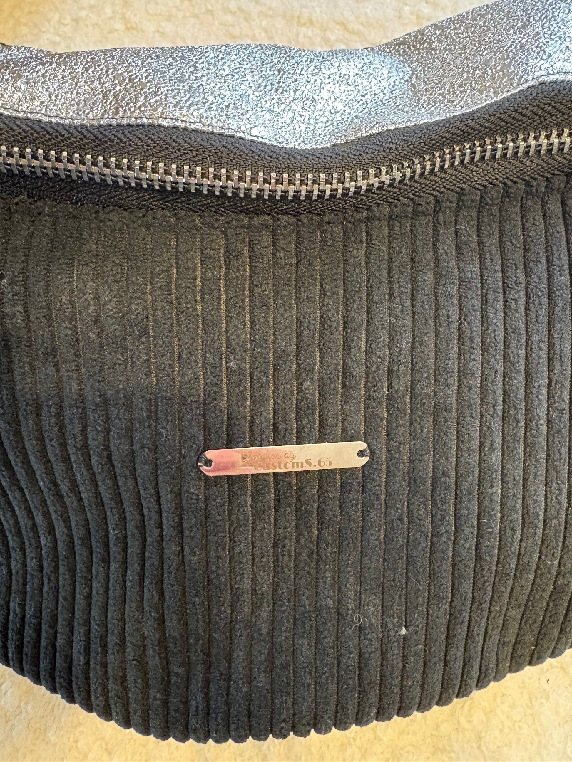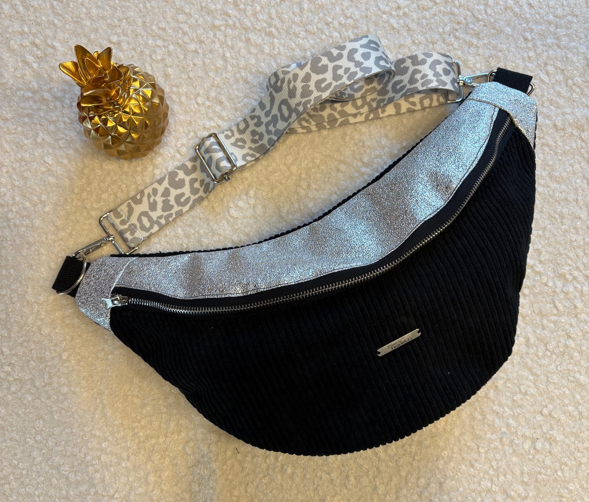 Sac banane XXL velour côtelé noir capot argenté sangle léopard grise