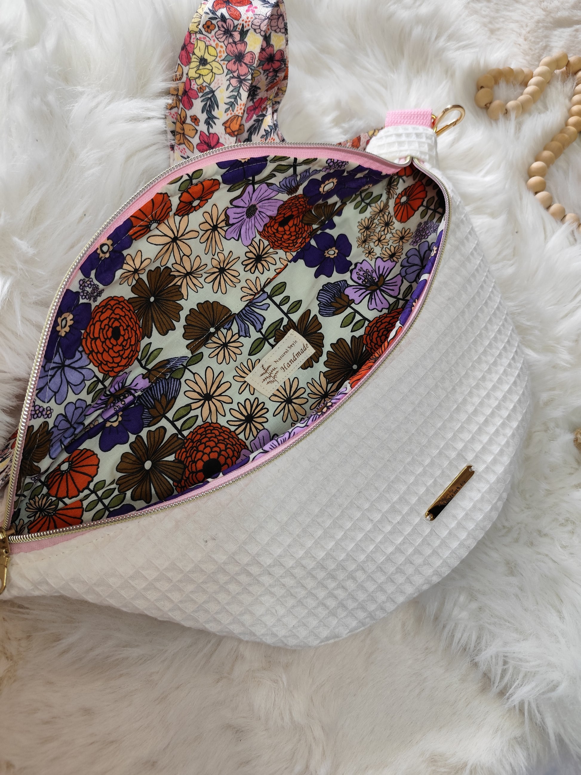 Sac banane nid d'abeilles blanc écru détail rose