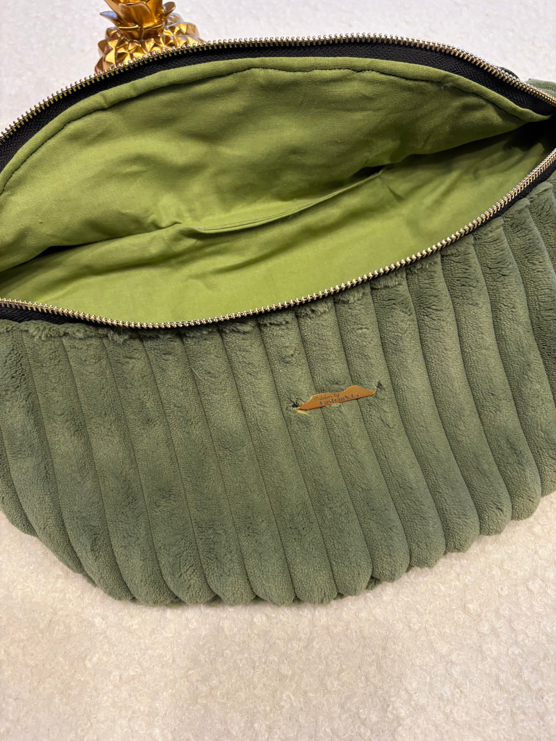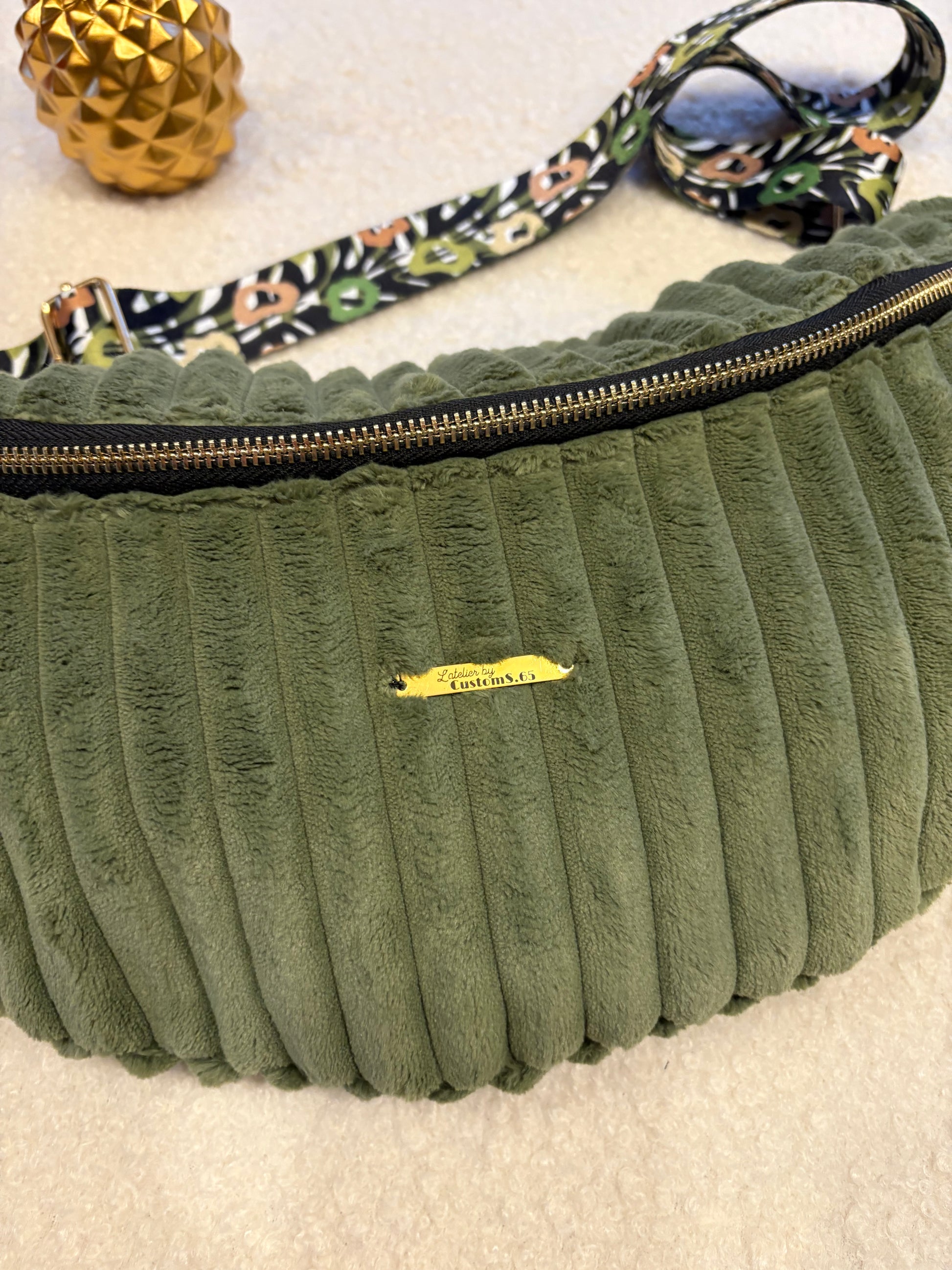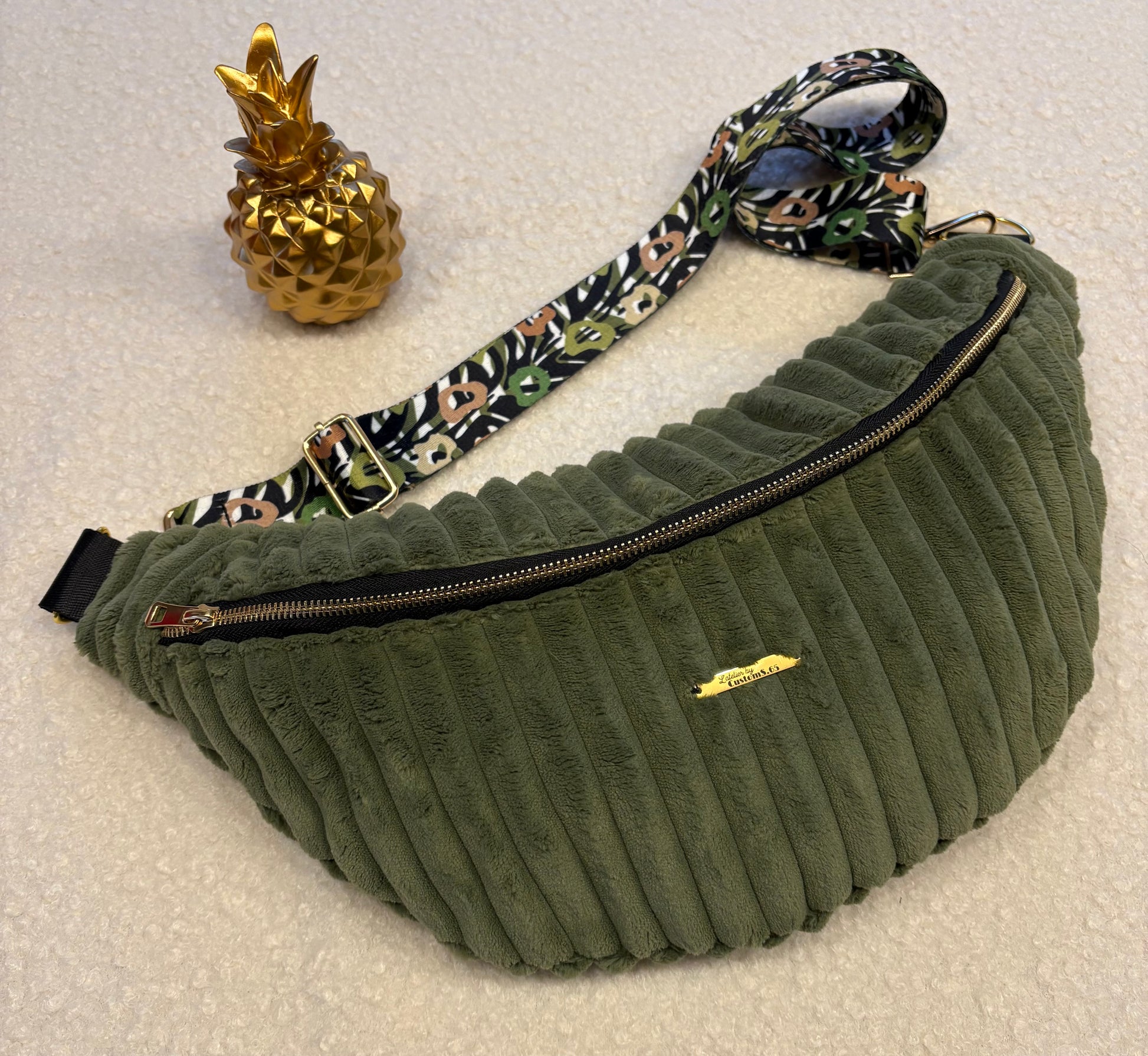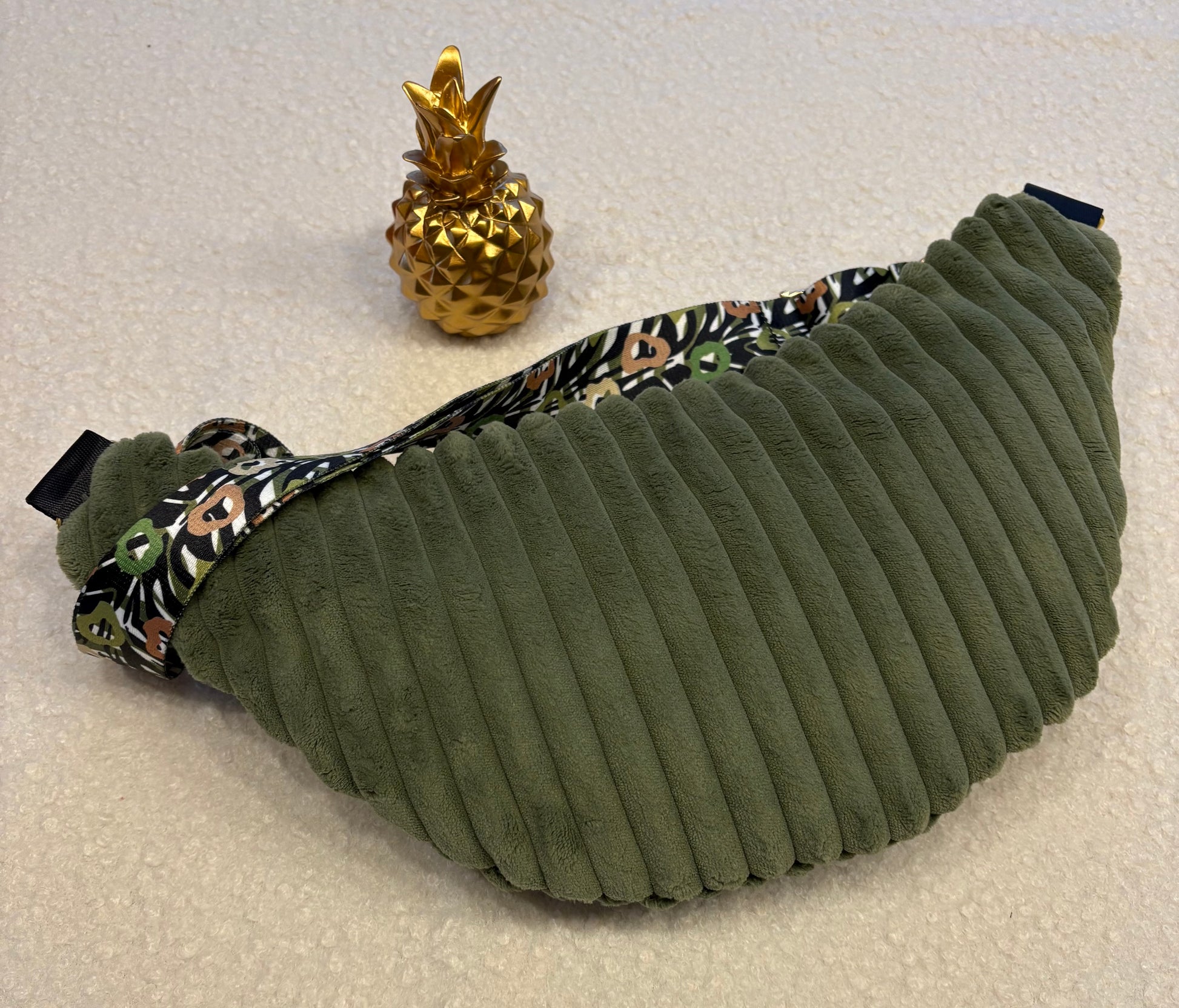 Sac banane XXL velour côtelé (trés large côte) kaki sangle fleurie noir/kaki
