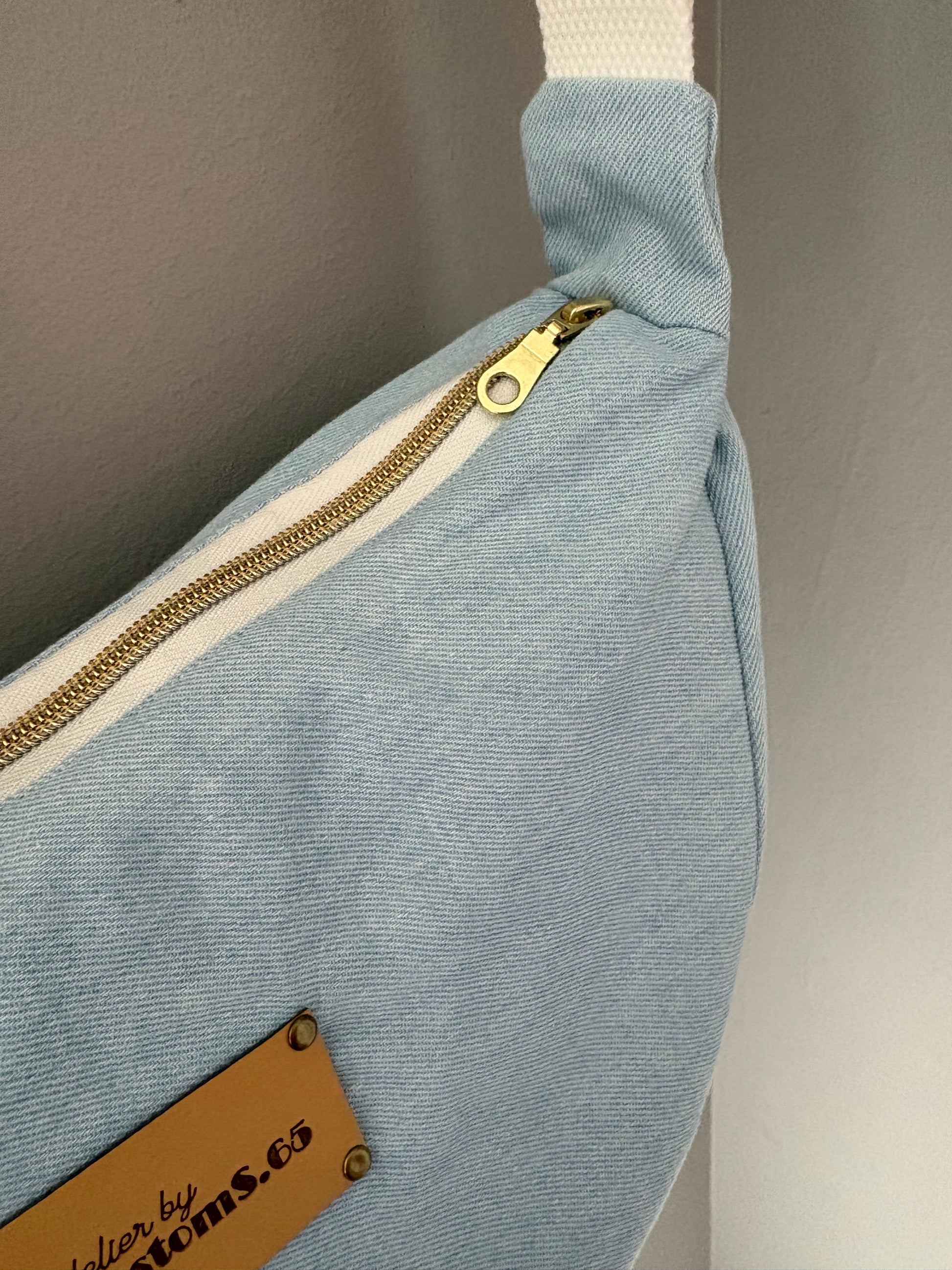 Sac demi-lune jean clair sangle crochet blanche fleurie