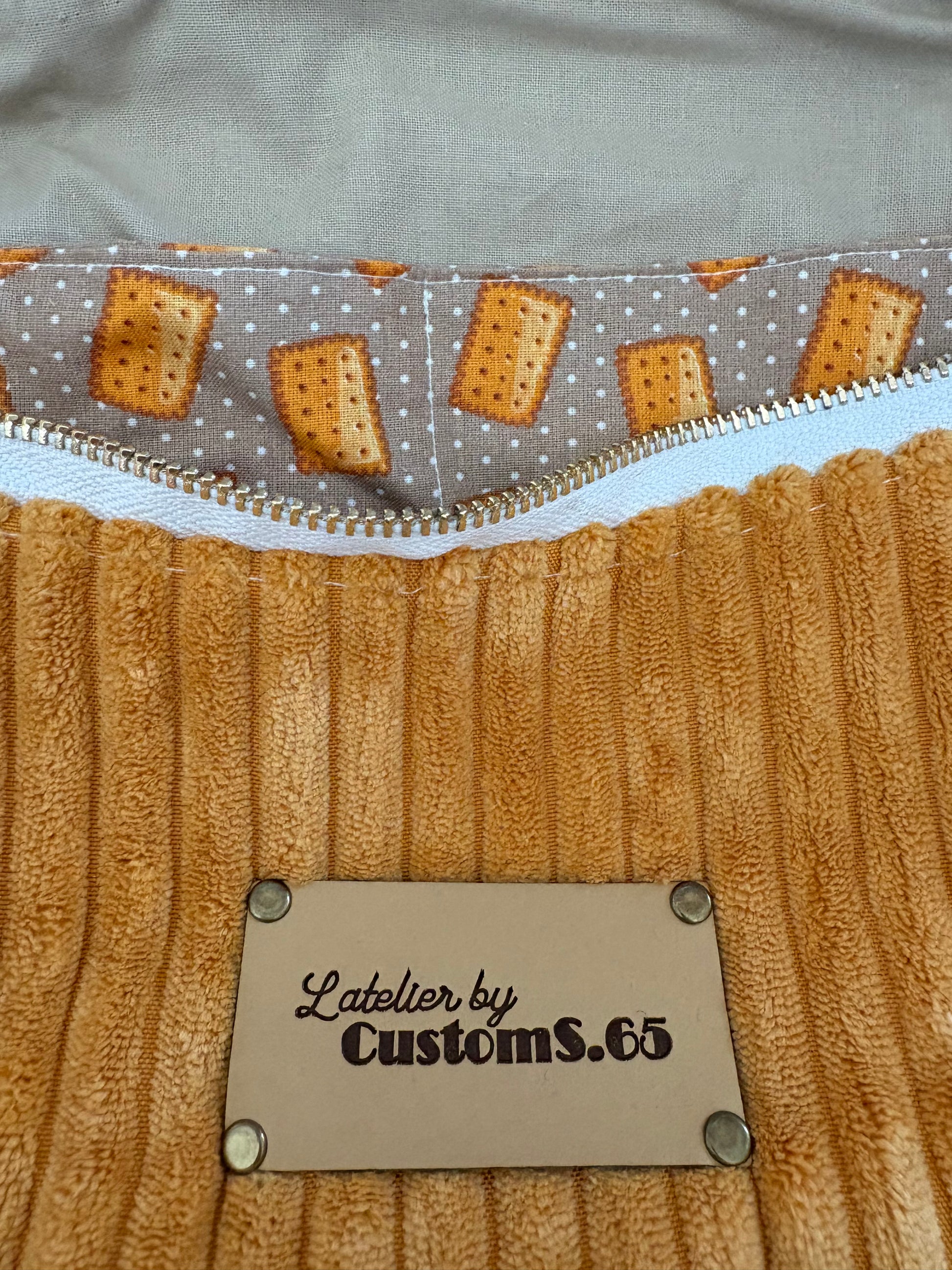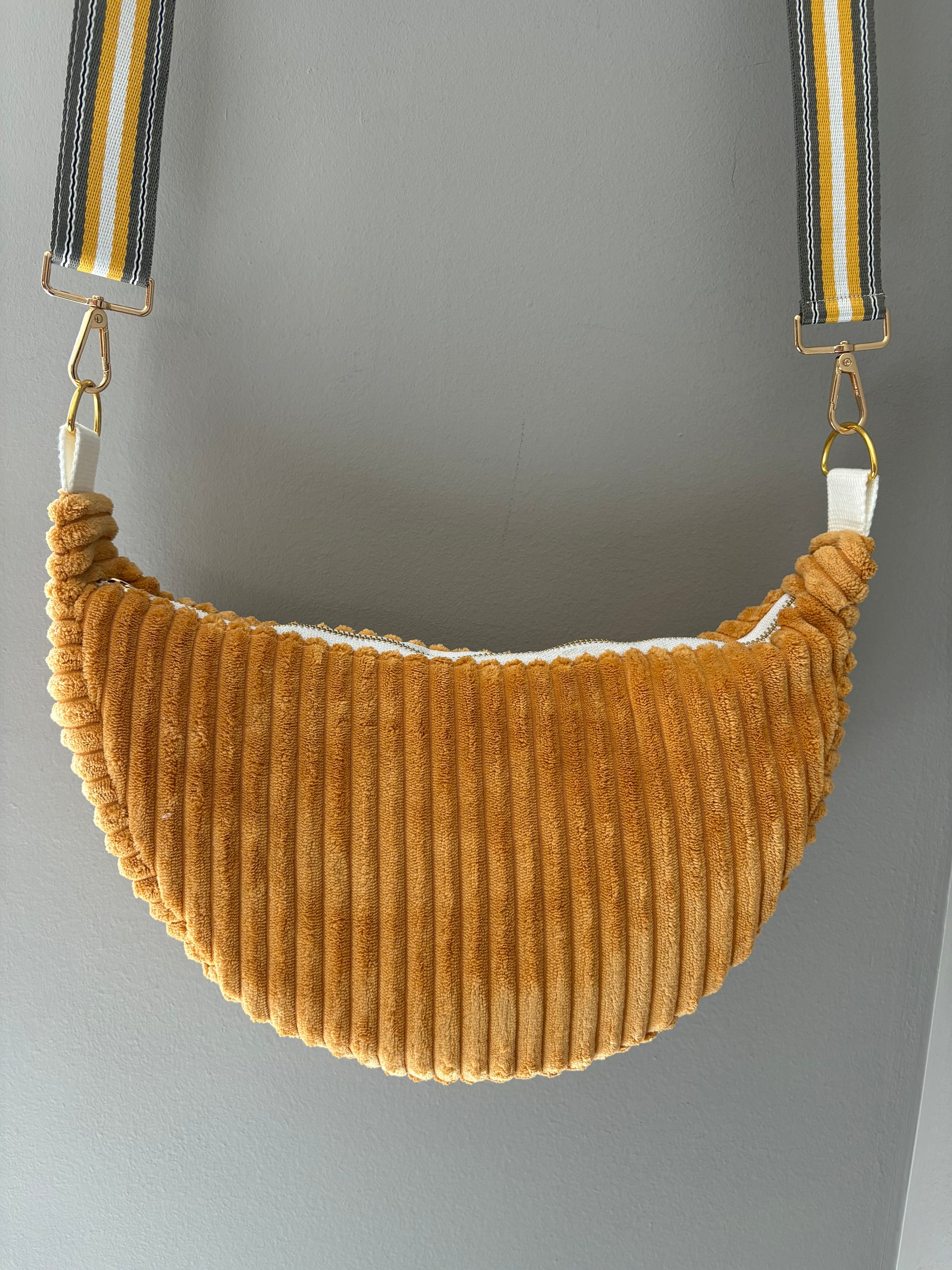 Sac demi-lune velour côtelé moutarde sangle noire et jaune