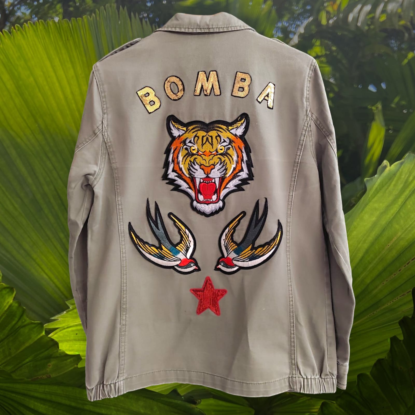 À partir de vestes de style militaires de seconde main, on imagine des créations pleines de caractère : patchs brodés, perles, sequins, messages inspirants ou symboles protecteurs… chaque détail est choisi pour donner une nouvelle âme à ces pièces chargées d’histoire.