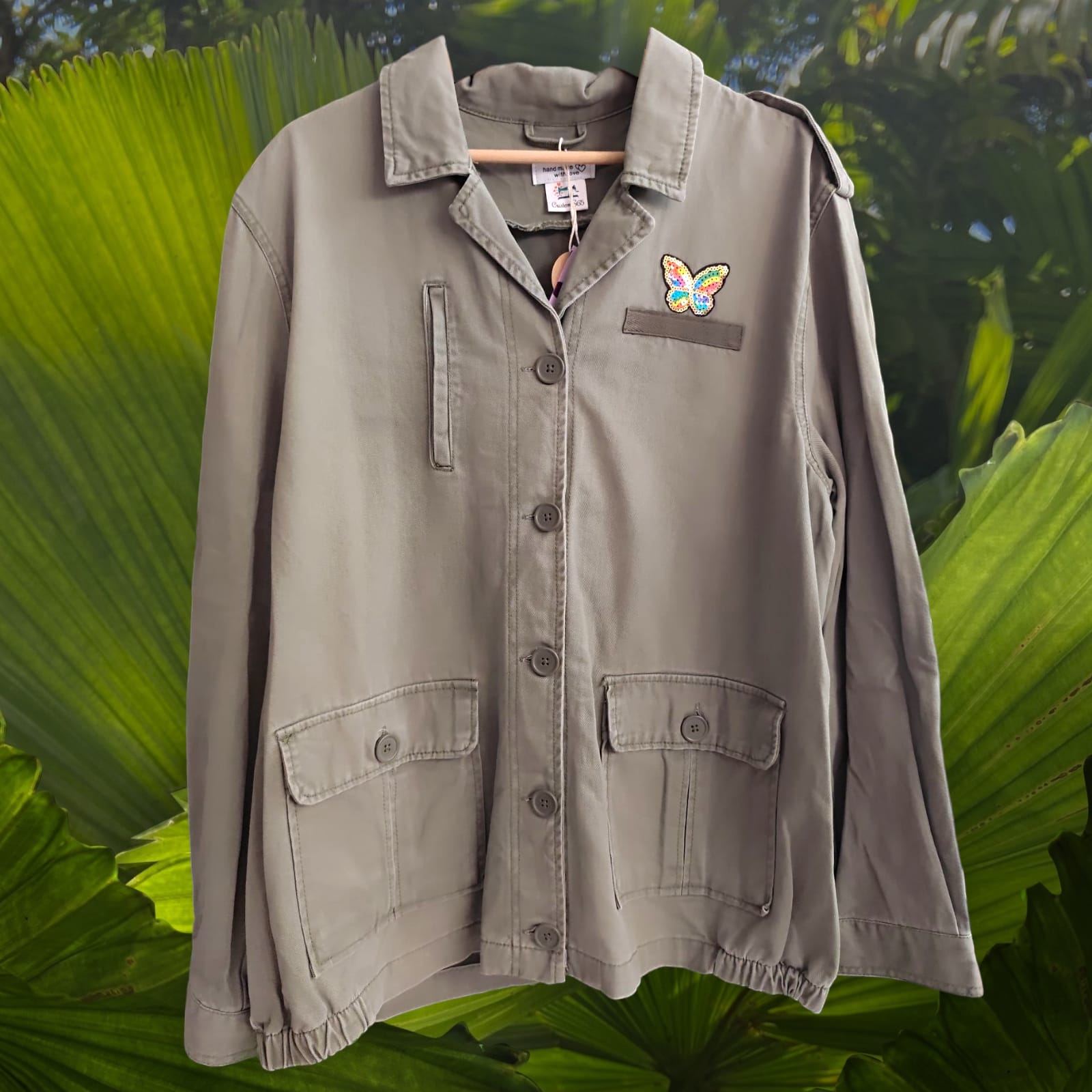 À partir de vestes de style militaires de seconde main, on imagine des créations pleines de caractère : patchs brodés, perles, sequins, messages inspirants ou symboles protecteurs… chaque détail est choisi pour donner une nouvelle âme à ces pièces chargées d’histoire.
