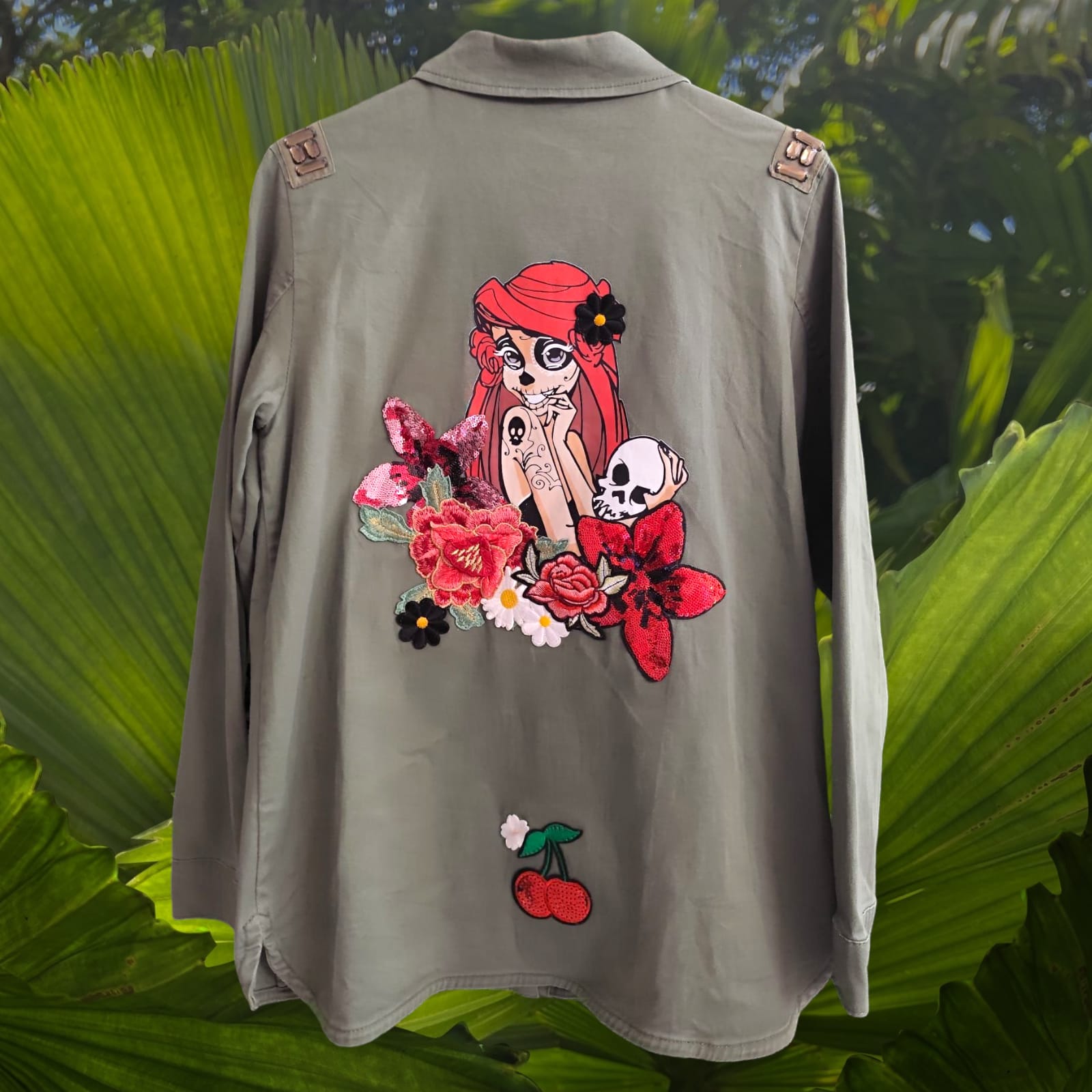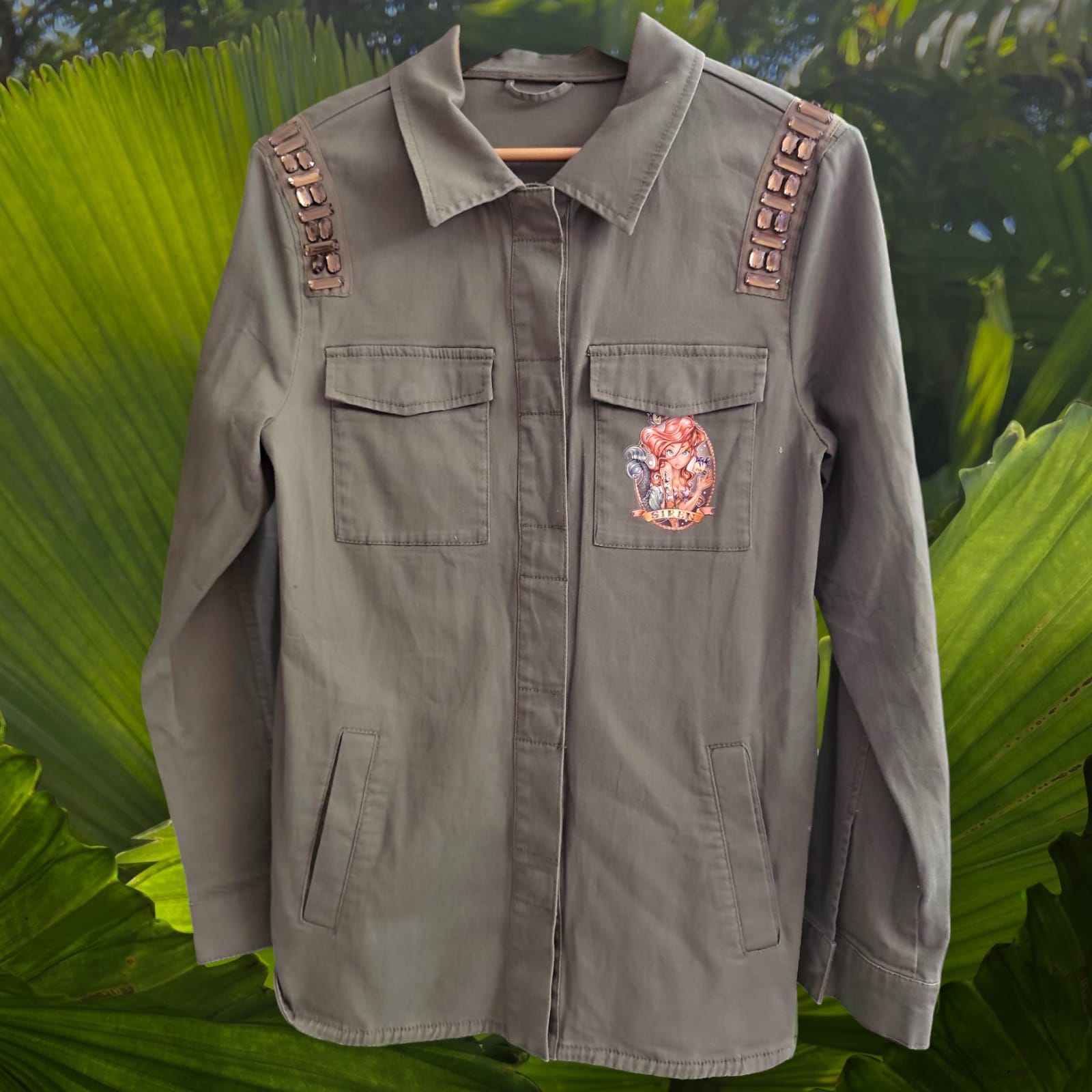Cette surchemise est upcyclée et entièrement customisée à la main dans notre atelier.