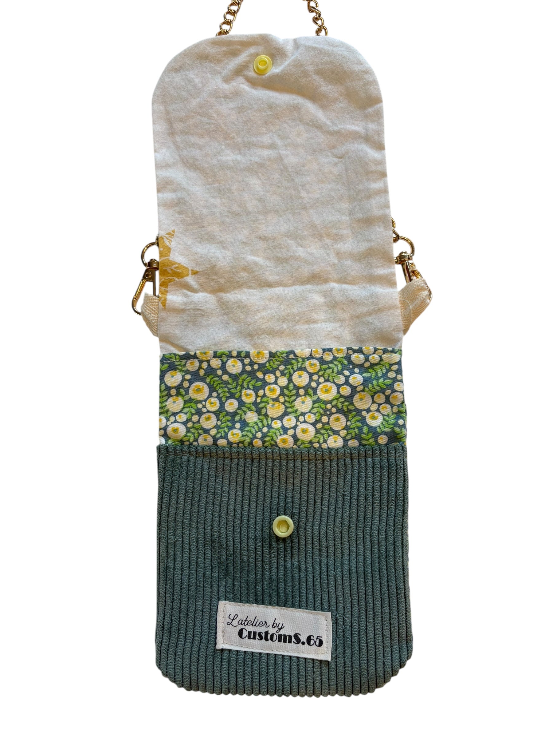Pochette téléphone rabat fleuri vert intérieur velour côtelé vert sangle métal doré