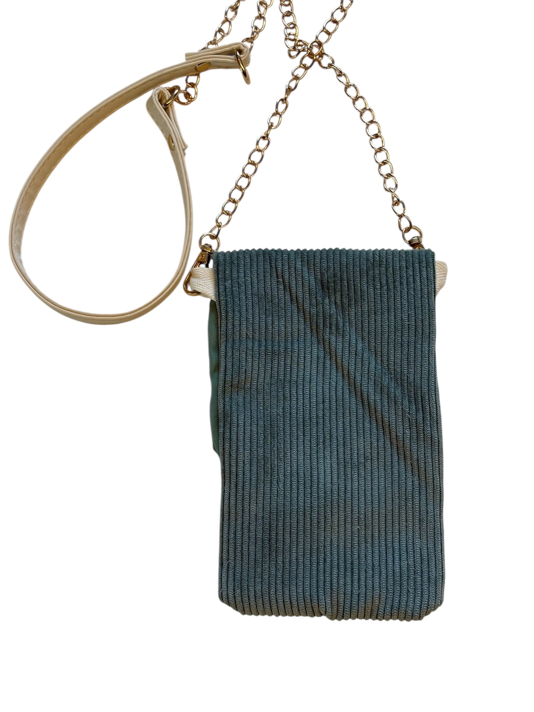 Pochette téléphone rabat velour côtelé vert intérieur fleuri sangle métal doré + cuir blanc