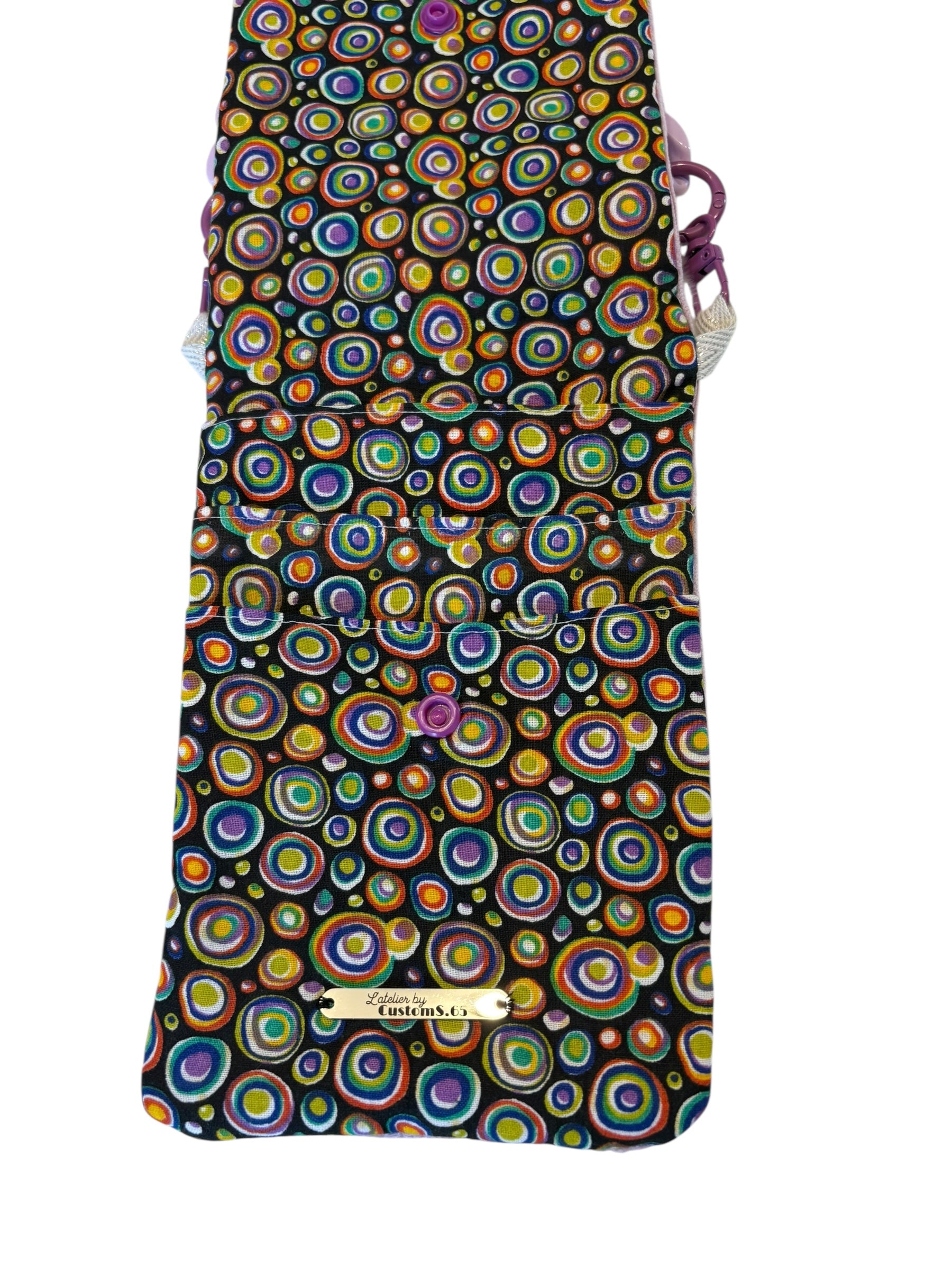 Pochette téléphone rabat velour côtelé parme intérieur psychédélique sangle parme