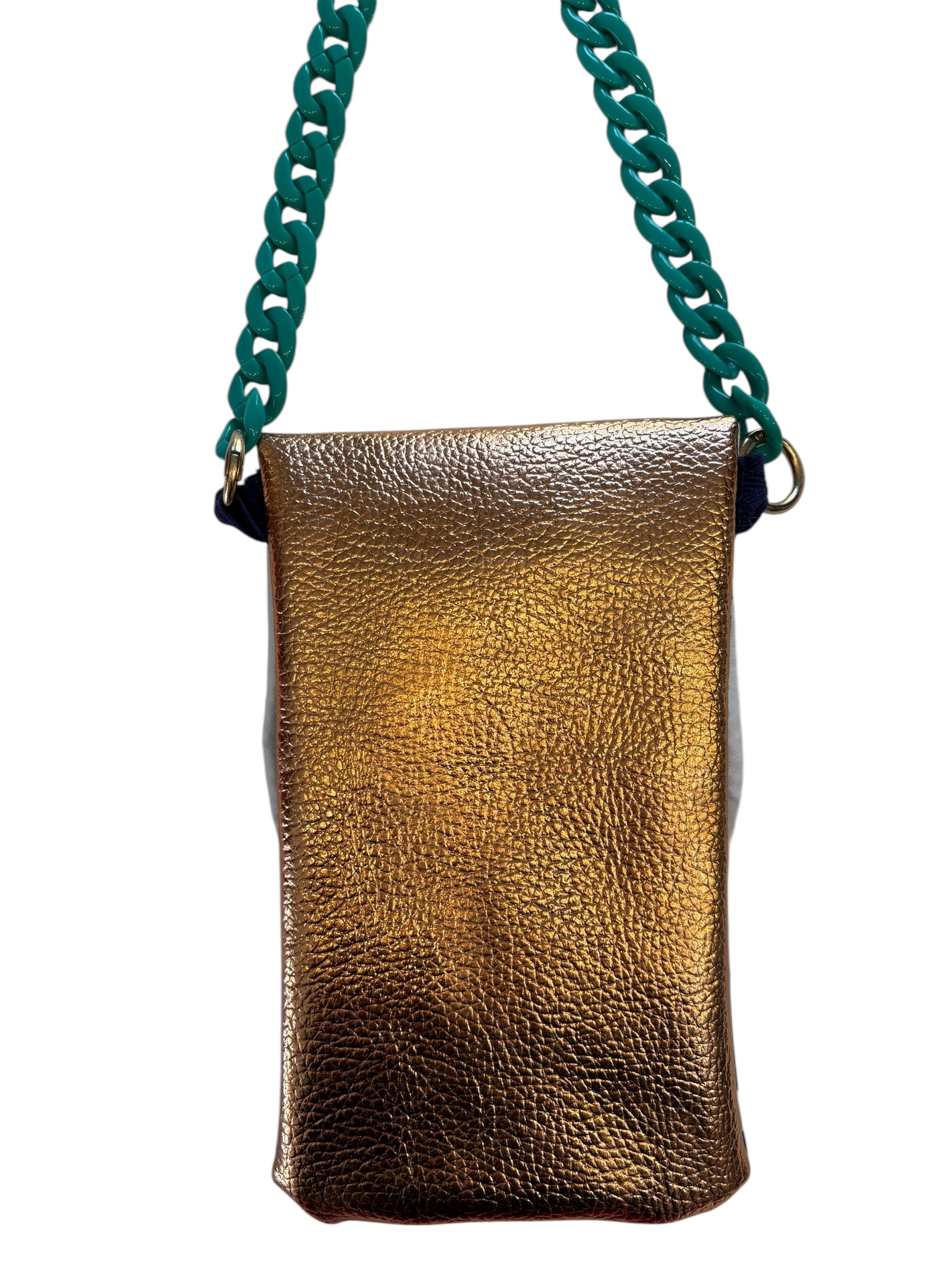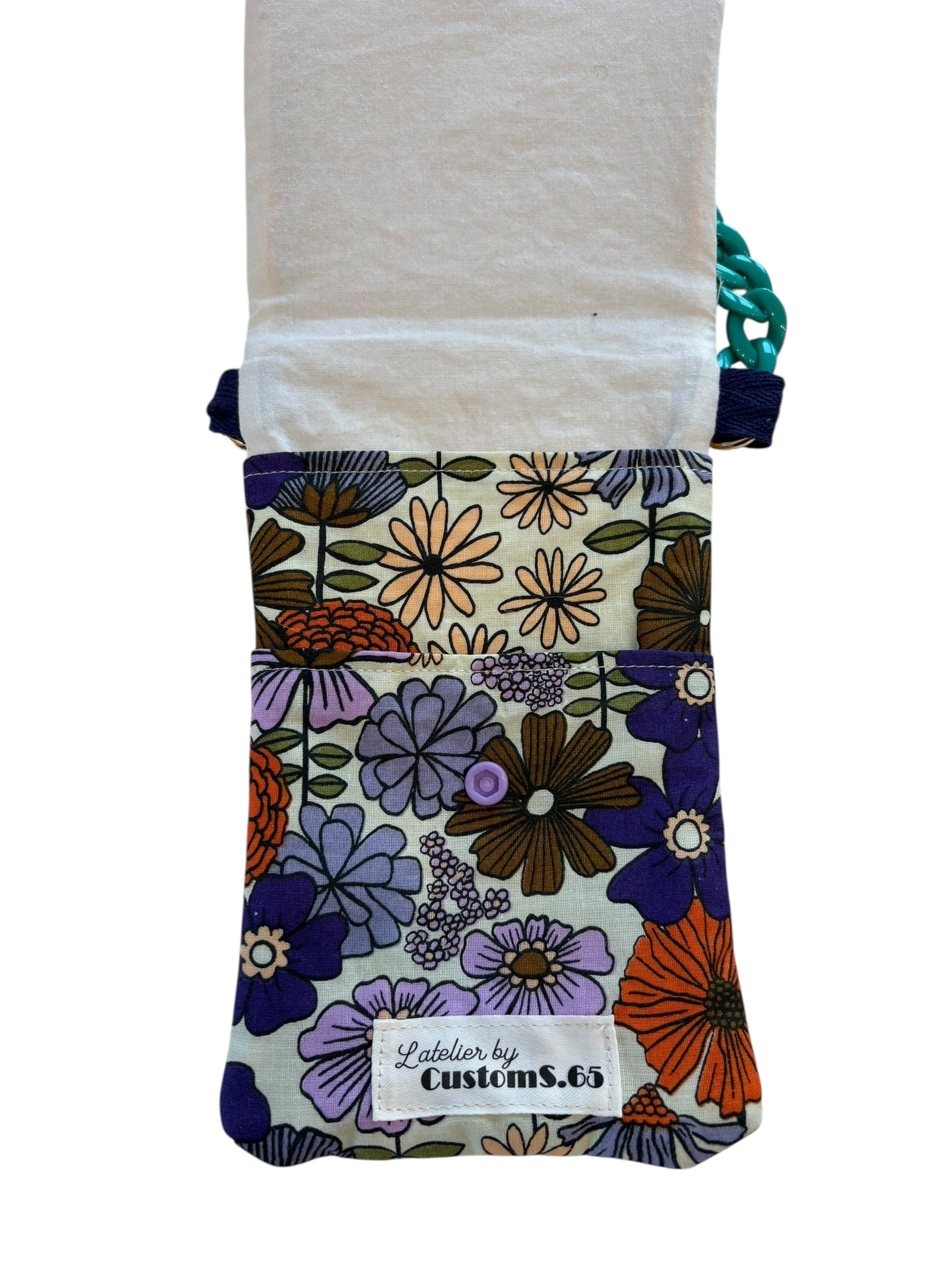 Pochette téléphone rabat pailleté bronze intérieur fleuri sangle verte